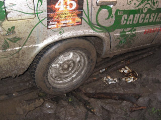 A továbbiakban a két autóval együtt rótta az utakat, egyre kevesebb versenyzővel találkoztunk, mignem sikerült ismét el-, illetve most fennakadnunk. Az előttünk lévők úgy kijárták az utat, hogy egy 30 centis bakháton megállt a Zsiga. Kínlódás, tologatás és húzogatás után jött az ötlet, hogy emeljük meg és tegyünk alá valamit, mert a tükörsima gumiknak máshogy nincs esélyük kimászni onnan.